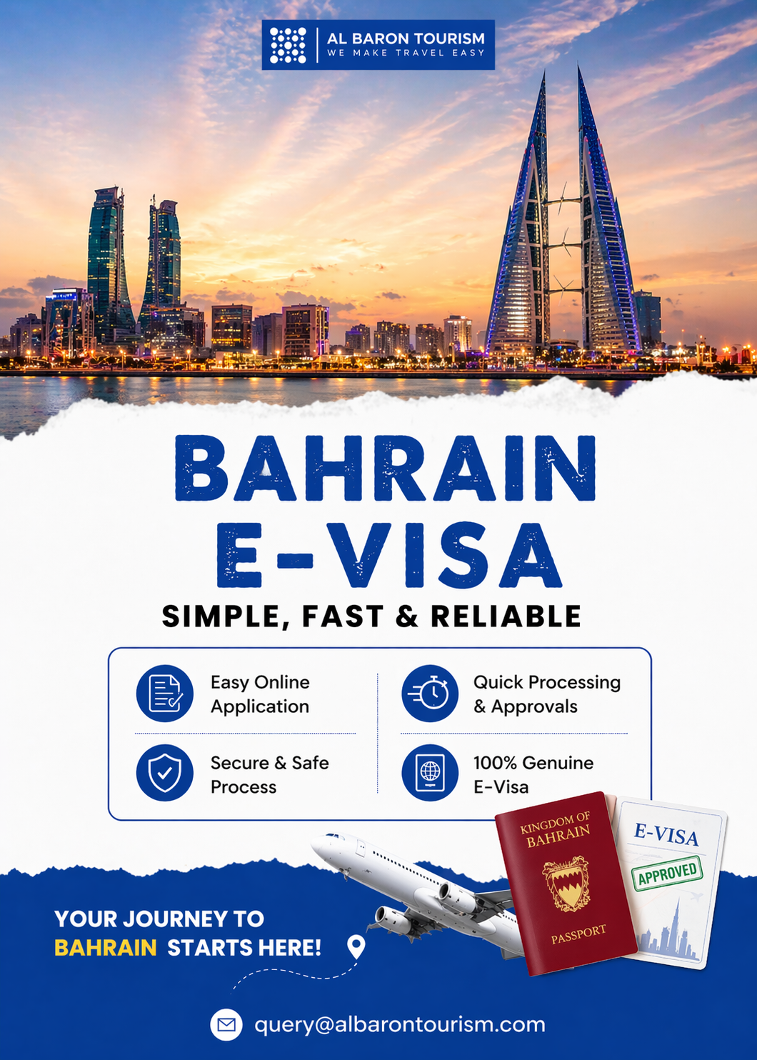 - Visit the official Bahrain eVisa portal or contact Al Baron Tourism