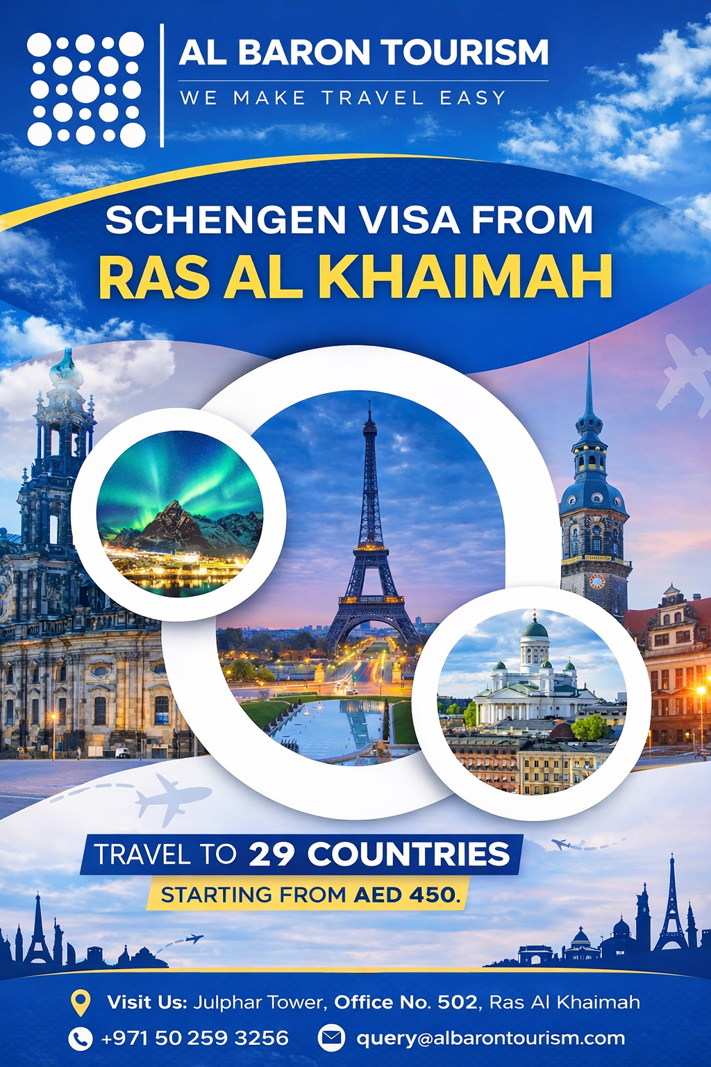 If you are based in Ras Al Khaimah, Al Baron Tourism is your trusted partner for Schengen visa services. We guide you through every step of the process, from document preparation to appointment assistance, ensuring a smooth and stress-free application.